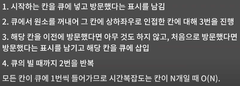 #include <bits/stdc++.h> using namespace std; #define X first #define Y second // pair에서 first, second를 줄여서 쓰기 위해서 사용 // t.first, t.second 대신 t.X, t.Y로 사용 가능 int board[502][502] = { {1,1,1,0,1,0,0,0,0,0}, {1,0,0,0,1,0,0,0,0,0}, {1,1,1,0,1,0,0,0,0,0}, {1,1,0,0,1,0,0,0,0,0}, {0,1,0,0,0,0,0,0,0,0}, {0,0,0,0,0,0,0,0,0,0}, {0,0,0,0,0,0,0,0,0,0} }; // 1이 파란 칸, 0이 빨간 칸에 대응 bool vis[502][502]; // 해당 칸을 방문했는지 여부를 저장 int n = 7, m = 10; // n = 행의 수, m = 열의 수 int dx[4] = { 1,0,-1,0 }; int dy[4] = { 0,1,0,-1 }; // 상하좌우 네 방향을 의미 int main(void) { ios::sync_with_stdio(0); cin.tie(0); queue<pair<int, int> > Q; vis[0][0] = 1; // (0, 0)을 방문했다고 명시 Q.push({ 0,0 }); // 큐에 시작점인 (0, 0)을 삽입. while (!Q.empty()) { pair<int, int> cur = Q.front(); Q.pop(); cout << '(' << cur.X << ", " << cur.Y << ") -> "; for (int dir = 0; dir < 4; dir++) { // 상하좌우 칸을 살펴볼 것이다. int nx = cur.X + dx[dir]; int ny = cur.Y + dy[dir]; // nx, ny에 dir에서 정한 방향의 인접한 칸의 좌표가 들어감 if (nx < 0 || nx >= n || ny < 0 || ny >= m) continue; // 범위 밖일 경우 넘어감 if (vis[nx][ny] || board[nx][ny] != 1) continue; // 이미 방문한 칸이거나 파란 칸이 아닐 경우 vis[nx][ny] = 1; // (nx, ny)를 방문했다고 명시 Q.push({ nx,ny }); } } }<출처: 바킹독의 실전 알고리즘 강의> https://www.youtube.com/watch?v=ftOmGdm95XI&list=PLtqbFd2VIQv4O6D6l9HcD732hdrnYb6CY&index=10