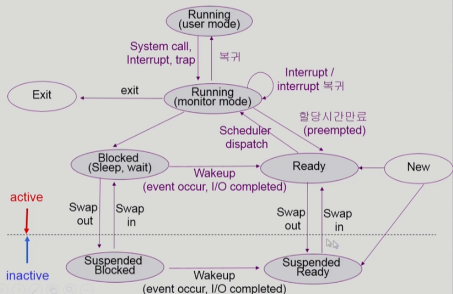 Blocked(=wait, sleep): CPU를 주어도 당장 instruction을 수행할 수 없는 상태