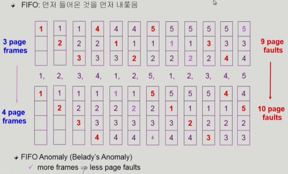 페이지 프레임이 많을수록 페이지 폴트가 많아져서 성능이 더 나빠지는 이상한 점 발생
